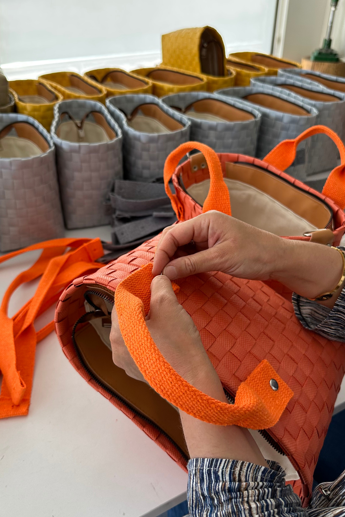 Geri dönüştürülmüş plastikten el ile örülen dayanıklı ve hafif sepet çantalarımız! Çevre bilinci ile üretilen bu çantayı tercih ederek doğa için bir iyilik yapabilirsiniz!